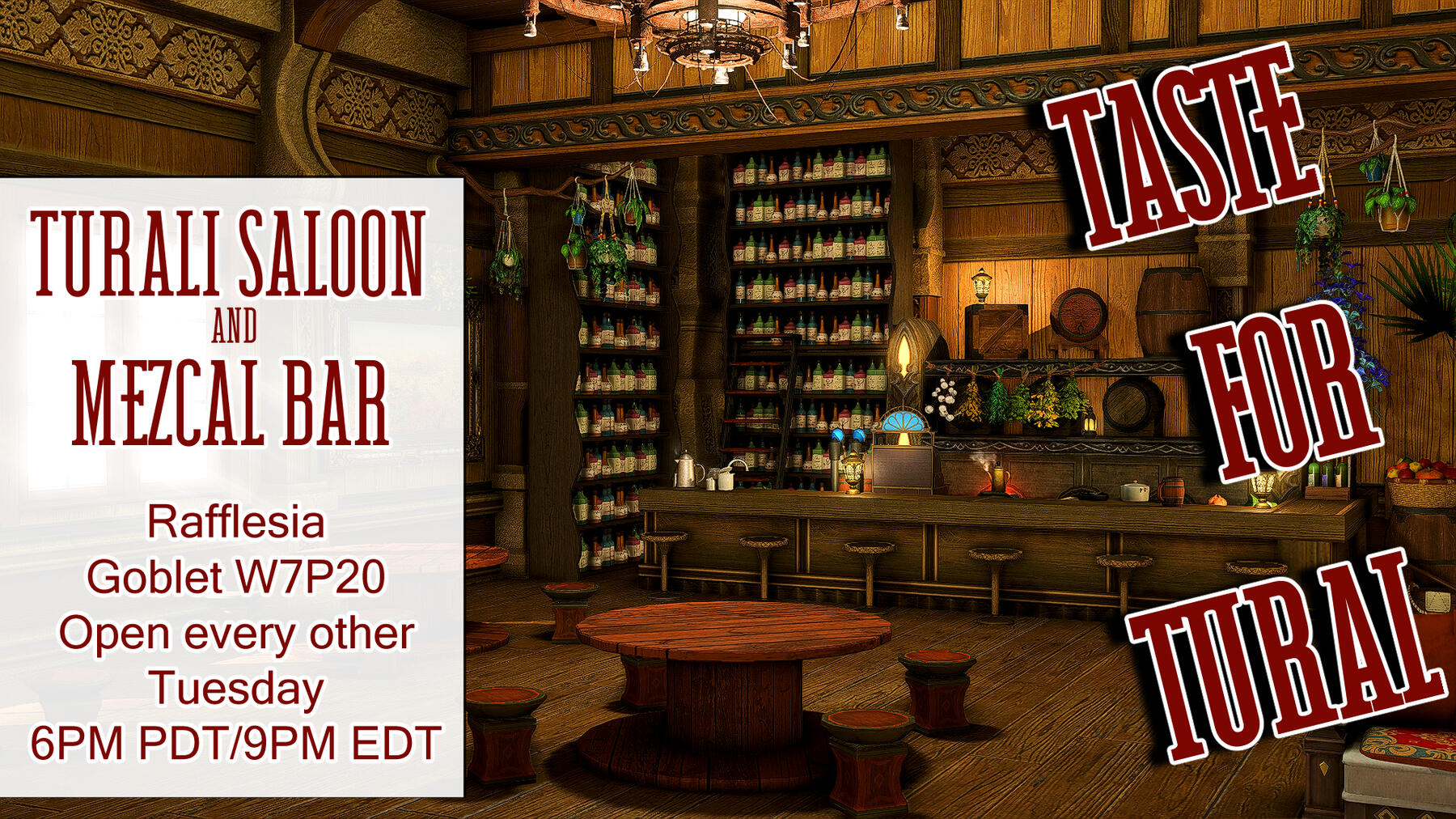 Taste for Tural is a Shaaloani inspired, Wild Western themed Mezcal Bar that promotes immersive RP with a focus on community and connection. Run by members of the LBGT+ community, we strive foster a safe and inclusive environment for RPers to meet and collaborate.Dynamis, Rafflesia | Goblet W7P20 | 6-10pm PDT